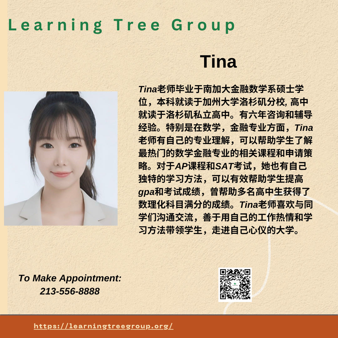 Tina老师毕业于南加大金融数学系硕士学位,本科就读于加州大学洛杉矶分校,高中就读于洛杉矶私立高中。有六年咨询和辅导经验。特别是在数学,金融专业方面,Tina老师有自己的专业理解,可以帮助学生了解最热门的数学金融专业的相关课程和申请策略。对于AP课程和SA7考试,她也有自己独特的学习方法,可以有效帮助学生提高gpa和考试成绩,曾帮助多名高中生获得了数理化科目满分的成绩。Tina老师喜欢与同学们沟通交流,善于用自己的工作热情和学习方法带领学生,走进自己心仪的大学。